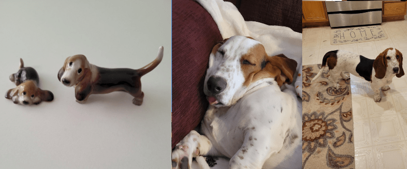 Miniature Basset Hound figurines from Edelweiss, our own Basset Hound puppy (she’s 7 months old, her name is Penelope, “Nellie” for short)